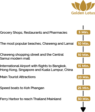 Golden Lotus luxury Boutique High-end Luxury Villas location is ideal for those who wish to spend their holiday break in a more tranquil atmosphere, far from the crowded streets of Chaweng. Still, with proximity and easy access to Koh Samui’s magnificent beaches (including the Chaweng), amenities, and all the attractions,.